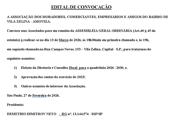 " Em nome dos moradores, comerciantes, empresários e amigos do Bairro de Vila Zelina e adjacências, agradecemos esta homenagem da parlamentar Vereadora Edir Sales e do Rotary Club Vila Prudente de reconhecimento do trabalho e projetos sócio-culturais realizados na região de Vila Prudente pela AMOVIZA".